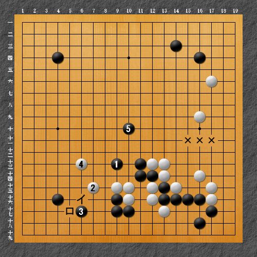 黒最善の攻め。白はツギかコウ受けかの岐路 白2とツケたら正着黒3ヒキ。白イのツギは死になので白4は必然。 続いて黒5とアテられ困った。白イのツギは狭められ二眼ないのです。 また白×とアテ返すのも黒イと取られて二眼出来ません。 ※よって白ロとコウ…